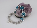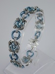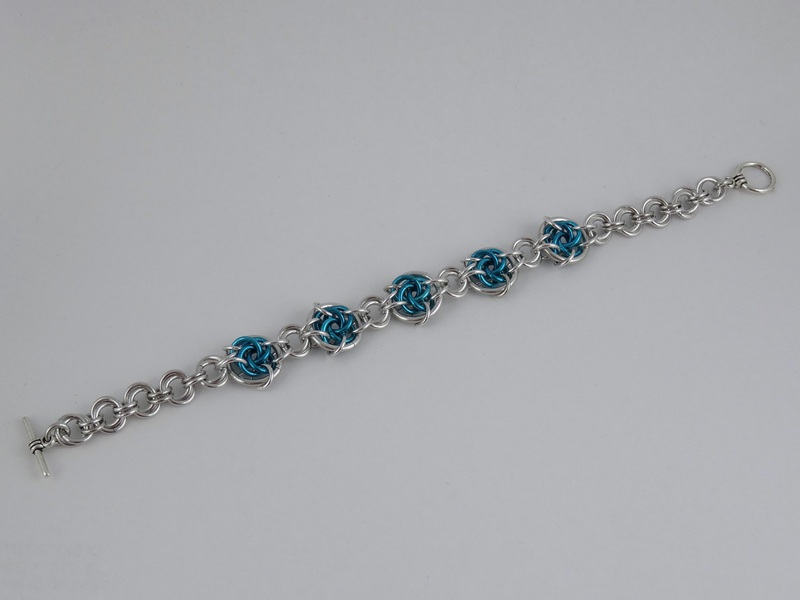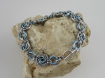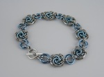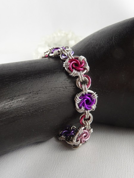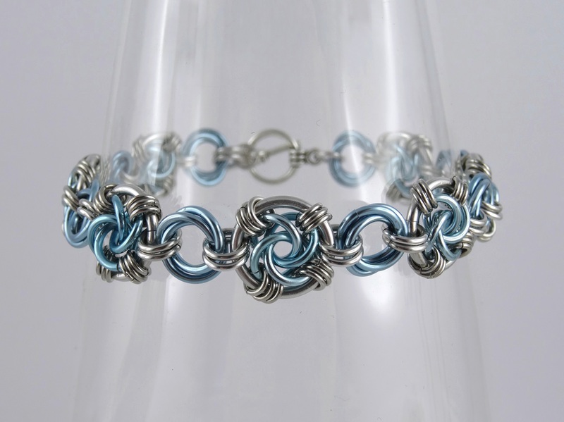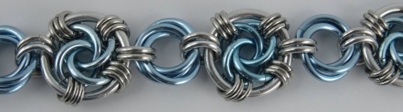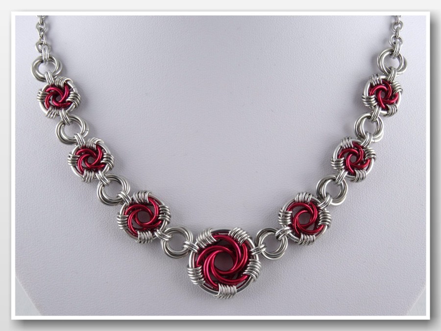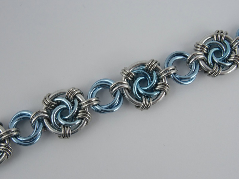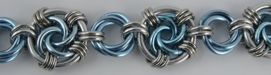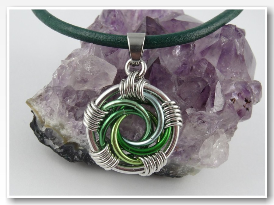 Der Swirl ist eigentlich eine Abwandlung des Musters Moebius, 3 oder mehr ineinander verbundene Ringe, die mit kleineren Ringen an einem Außenring befestigt werden. Dadurch ergibt sich ein schöner Anhänger, der aneinandergereiht ein schönes gleichmäßiges Muster ergibt.
