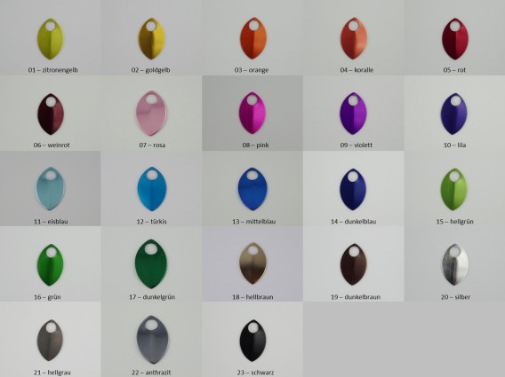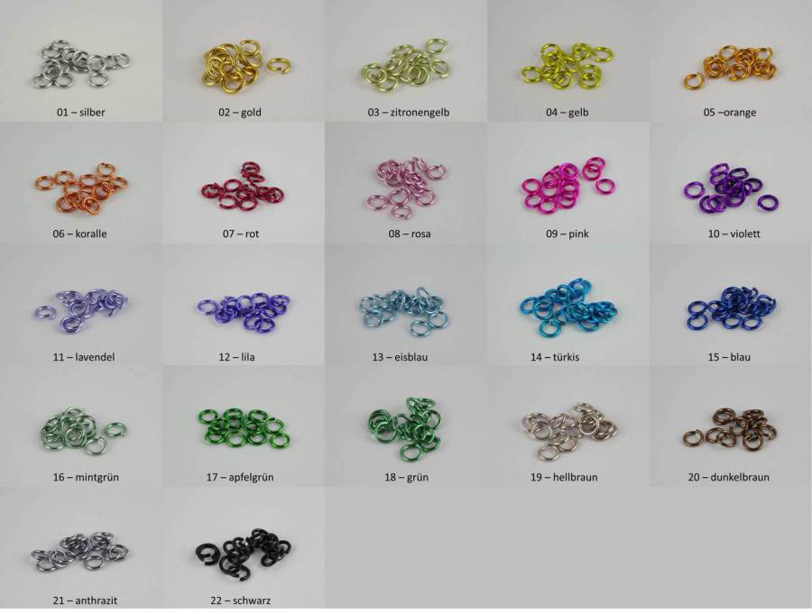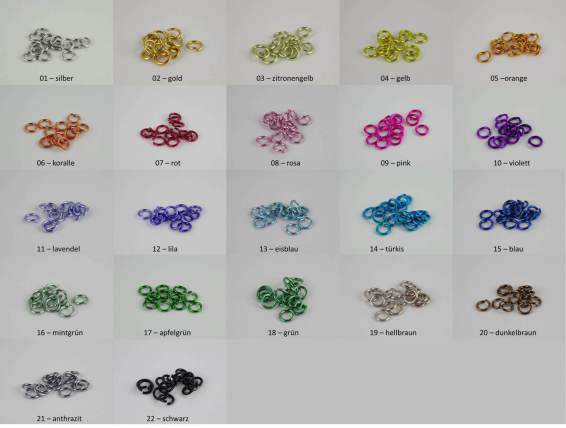 Ich habe mal versucht, die gängigsten Ringfarben zusammen zu fassen. Falls Euer Lieblingston nicht dabei ist, einfach bei mir anfragen. Es kann durchaus sein, dass ich noch Sonderfarben oder Reste zuhause habe.